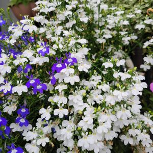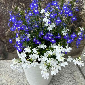 先日お迎えしたロベリアさん🔹🔷青と白の2色植え 爽やかです🌿 シクラメンの鉢をリメイクしてシルバーリーフの前に植えています🪴