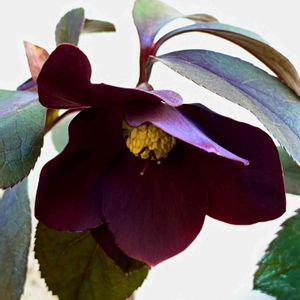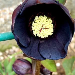 こちらのクリスマスローズはブラックパール。 花も葉もかなり黒っぽくて、 下向きに咲く花は上から見るとしべの部分が見えないので、全体を上から見るとホントに真っ黒です。