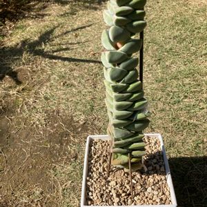 今西側の多肉棚の多肉を 廊下に避難中 曲がってしまった紀の川さん添え木に縛って真っ直ぐに手直し 真っ直ぐ❓になった🙌