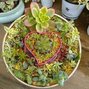 百均のザルをリース(夕映えメイン)に仕立て、真ん中に💗の缶を置いてみました💕 多肉寄せ植えの出来上がりです✨🌱✨