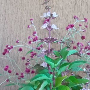 庭のお花を切り花で楽しんでいます🎶 花持ちがいいので嬉しいです 台湾バジル 九層塔 検索したら台湾バジルと出ました 千日小坊 小さな小さなお花です
