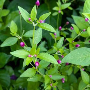 【アルテルナンテラ 千紅花火(千日小坊)】 南アメリカ原産、ヒユ科多年草 茎上部の葉の付け根から花柄を伸ばし、センニチコウの花穂を小さくしたような可愛い花をたくさん咲かせる。 花穂の大きさは、5~10mmほど。 センニチコウ(千日紅)に似た小さな花をつけることから、センニチコボウ(千日小坊)という名が付けられた。 日が短くなると花を咲かせる短日性植物で、街灯の下など、夜に明るい場所では咲かない。 草丈:30~60cm 開花時期:10月~12月 花色:赤紫 ガーデンマルシェ防府にて