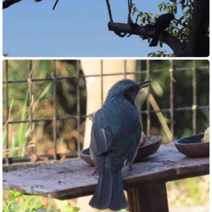 雨の庭☔️ バナナが雨に濡れないように籠に入れておきました、 ちょっとつっついて、、安心したのか美味しそうに完食🍌