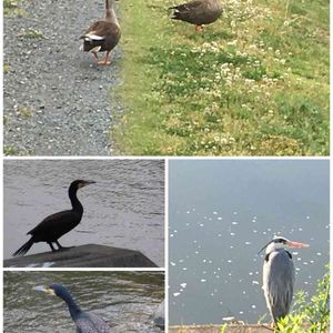 夕方ウォーキングで出会った野鳥たち 土手道散歩中の鴨🦆🦆 カワウ アオサギ