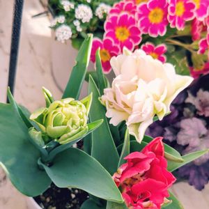 チューリップ🌷が咲きました❣ 2月に鳥被害にあったジュリアンさん、丸坊主状態がここまで育ってくれたぁ〜🎶 ミニバラに見える🤍コ、花数が凄ぃ! お正月明けにお迎えして、初upです😆