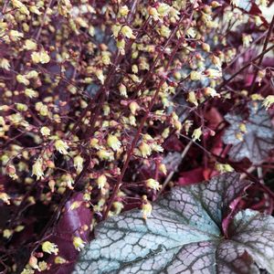 こんばんゎ🌛 カラーリーフが魅力の ヒューケラに細い花茎を伸ばして、壺形の愛らしいお花が密に咲きました