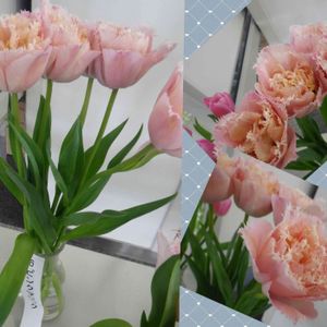 八重咲きチューリップ咲き揃いました🌷😊 蕾はグロテスクだったけど、こんな可愛いピンクに染まりました。 開くまでに4日ほどかかり、花びらがしっかりしているので、花持ちが良さそうです💮 雄しべが黒いのが虫みたいで、中を覗く度にちょっとドキッとします😅