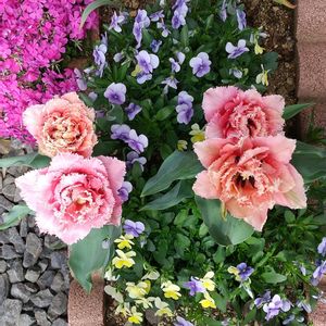 チューリップ、ベロナ4球とピンクマジック4球を植えた花壇 結果はベロナ1球(もう咲き終わった)とピンクマジック4球でした ベロナ3球も出てこないし、ベロナとピンクマジックの時期ずれるし😥 でも高かった💴ピンクマジックが全部咲いて良かった 八重のフリンジ咲き、ちょっと珍しい