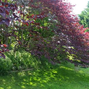 今日の花 ハナズオウです。 一昨年の4月 見たことのないシックな赤紫色の葉を持つ素敵な花に出会いました。🎶 花はハナズオウに似ていたので調べてみるとアメリカハナズオウとわかりました。その時セルリアの花も初めて知りました。流石おしゃれな街に似あう花達でした。 (^▽^)/(^^♪