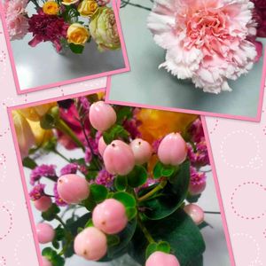 昨日、娘がいただいて来たお花 ピンクのフリフリのカーネーション🌸 ヒペリカムは、ツヤツヤしていて、かわいい(ღ˘⌣˘ღ) 🏷19日はピンクの日