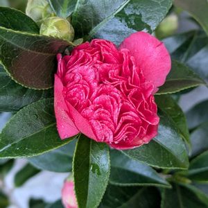 椿 弁天神楽 2番花も咲きました🤗 私のコレクションにはあまり無い獅子咲きになるのかなぁ…🤔 1番花よりはマシな感じ👍 このクシャクシャって感じが面白い花姿ですね〜 あとは蕾無く、寂しい限り…。来年はもっといっぱい蕾を付けてくれるよう、成長を期待します🙏