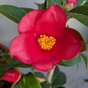 椿 黒獅子錦魚葉椿 まだ完全開花ではないけれど、この位もイイもんです😊 なにせたったひとつ付いた花なので…😅 集中して見る事になるんで、照れずに咲いてね〜🤗
