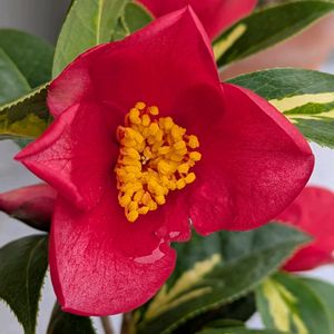 椿 金世界 この前、蕾の投稿でしたが、ついに咲いてくれました🤗 初の開花✌️ ありふれた感じの花だけど、斑入り葉と相まってイイもんです😘 思えばいくつか斑入り葉のがあるけど、花が咲いたのは初めてかな? いくつか蕾を付けてくれているので、まだまだ楽しめますな‼️