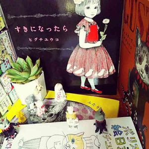 猛暑の日 部屋で撮った1枚 ヒグチユウコさんの絵本と キャラクターで少しお遊び💕 エケベリアのフロリディティ 猛暑を乗り越え生き残りそうな エケちゃんです🎵