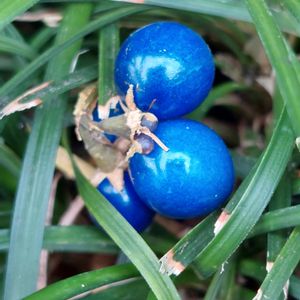 おはようございます😀 葉っぱを掻き分けたら出てきました! 青い宝石💎✨ リュウノヒゲでしょうか? 白いお花が咲くようですか観たことないなぁ🤔