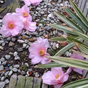 椿 有楽(太郎冠者) 咲き始めました。 来たる寒波に備えて、玄関脇北側にある軒下に台風用の防風ネットを張りました。 そこに鉢を移動。 北風が弱まるだけで体感が違うのが分かりました。 家の中に土を持ち込まない約束なので、そこで耐えてもらうしかないです😰 地植えの花もがんばって🙏 今日は雨 家が早々と対策すると軽く通過してくれる台風のように、寒波もささっと通り過ぎてくれると良いな・・・ 外水栓の保護、完了