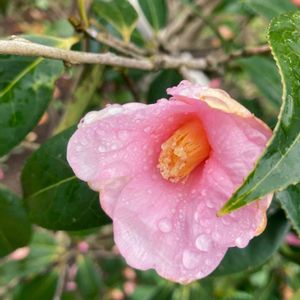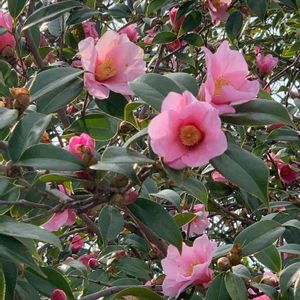 おはようございます😃 私の知る、太郎冠者(有楽)の中で一番大きな木です。 満開です。 侘助椿の中では一番大きな花でしょう。 侘助は全て、この花の子孫だそうです。🤔 透明感のある淡いピンクの花びら。 中央部だけが濃い色をしています。 花付きも非常に良くて、木全体がピンクに見えるほどです。 ピンク色の椿もたくさんありますが、この花はその中でも代表的な花でしょう。😘 織田信長の弟、武士茶道の織田有楽斎が好んで茶花として使ったことから有楽の名前が付いたそうです。 東京の有楽町の名もそのようです。😊