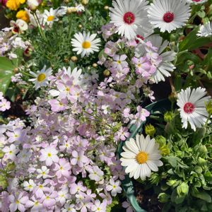 💕春の寄せ植え💕 ジョイフルに行って、寄せ植え用の花を買うのにアレコレ見てたら、寄せ植えしてあるのに目が行き、思わず買ってしまった。 咲く花の時期が同じものをチョイスするのは、素人では難しい。これだけ花数を寄せて、ベビーピンクの花でまとめて、今が盛りと咲いてる。さすがプロ😍 ウインティーのローズ、ピーチ、ライムグリーンの三種は、ネットで購入したけど、サクラは購入してなかったので、ちょうど良かったわ😄 夜はビニール温室に入れてます。 白の素焼き鉢なので、とても重い。