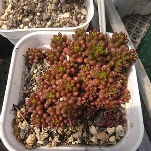 レッドベリーの葉挿し。他のレッドベリーはみどりんなのに、これだけはまだ赤い。 そして私の手は多肉&めだか焼けで、すでに手首から先が真っ黒ですw