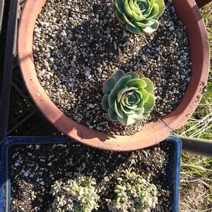 七福神と姫秀麗を大きな鉢へ。わさわさにしたいなー。 本当は地植えにしたいけど、ハウス内の草取りを断念し、「多肉の中に雑草生えたなら、雑草枯れるまで水を切っちゃえばいいじゃない」作戦をハウスで決行するため、鉢植えに。この鉢も、家にあったものを再利用ー。
