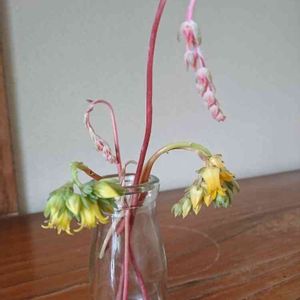 一応多肉画像だよ💦 花芽をカットし、花茎の葉は葉挿し用に全部もぎ、残った花だけ持ち帰って飾ってます。 実生にも憧れるけど、根気がないからな~(;つД`)