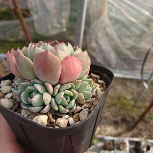 七福美尼さん。全部で7つほど仔株がついてるこだくさん母さん。 セオリー的には「親株カットで仔株を育てる」だろうけど、購入した生産者さんいわく「仔株外して行った方がいいよ」とのこと。 うーん、どっちがいいかなー。