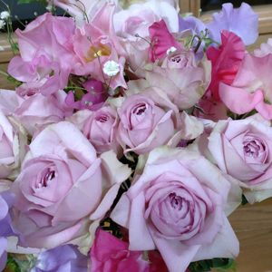 🎶 ブーケ💐 ♫ 薔薇、スィートピー、サイネリア、マトリカリア、チューリップ🌷など、優しい色のお花にしてもらいました💓 嬉しいなあ…ありがとうです💓
