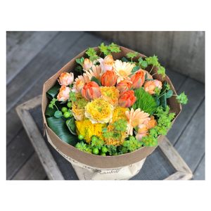 おはようございます😊 ご主人様から奥様に誕生日のブーケ☺️ イエローオレンジ系でお任せ👍 もうチューリップとラナンキュラスも今シーズン最後かな☺️ 生産者の皆様ありがとうございました🤗