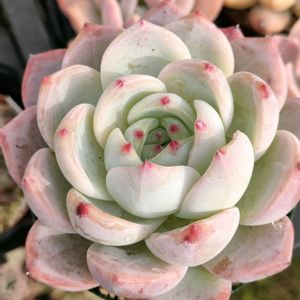 フリマサイトで夏前にお迎えした葉挿しのおらいさん苗、ももりんです✨🥰 今年の酷暑を乗り越えて秋の成長期を経て、中心付近がももりんらしくなってきた…かな⁉️😆💕💕