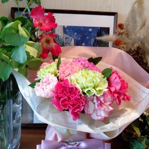 娘より花のブーケです❇️ 色とりどりのカーネーション! いったい何色あるのかしら 1.....2..3.4.5.6色ありました。 最近グリーンの花を 見かけますね。 左手花瓶には咲き終わった グリーンぽい クリスマスローズです。 良い1日をお過ごし下さいね🌿