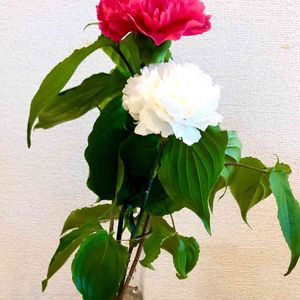 母の日に 花屋さんで買った赤と白のカーネーションに、ウチの庭のヤマボウシの緑の葉を添えました。🔴⚪️🟢