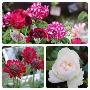 アイビーゼラニウム♪イギリスでは窓辺に置いたりします。茎が下に垂れるので、ウォールバスケットやハンギングに適しています。赤いスカビオサは変わり種です。寄せ植えのアクセントにちょうど良いですね(^。^)ボレロはロゼット咲き、芯の部分がいくつか別れた豪華なバラ。香りがフルーツのようで芳醇な香りです(*^^*)