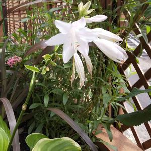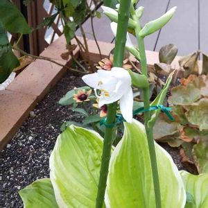ホスタの花が咲き始めました、やっほーぃ🎵 昨夜、義実家から帰宅し、夜中に急いで花壇の花達に支柱を立てました🌱 台風、心配😥