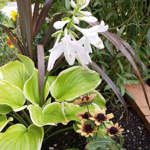 玄関脇の花壇もお花が咲くと一際目立つ 我が家では唯一香りのあるホスタ フレグラントブーケの白いお花 ほんのり甘い良い香り〜(*´꒳`*)