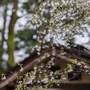 咲き出した富士桜が小屋の屋根にかかっています 楚々とした風情のお花で一番惹かれている桜です 白花ですが 蕾は仄かにピンクがかっています