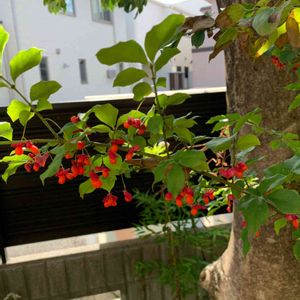 おはようございます。 夜中に、少し降ったのか 辺りは しっとり。 何か分からず拾ってきた赤い実。 芽生えてしばらく、謎でしたが、調べたら、コマユミでした。 紅葉に見ごたえが出るまで まだまだ、かかりそうです。