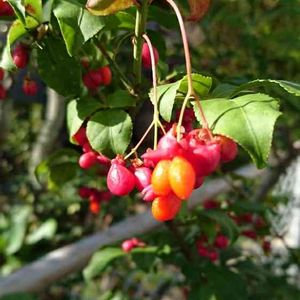鳥の落とし物が可愛らしい実をつけました。 これは何の実でしょうか? ご存知の方よろしくお願いします。 ゆずさんに「コマユミ」と教えて頂きました。