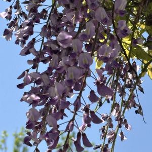 近くの公園で 青空から降り注ぐ藤のお花が綺麗です クローバーを散歩するアオスジアゲハ、キラキラしていました✨✨