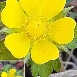 山の麓の田畑散歩🎶 ヤブヘビイチゴです😍 ヘビイチゴは普通の萼に加えて、幅広の副萼片があって、ヤブヘビイチゴはそれが大きく襟巻きトカゲみたいに正面からもハッキリ見えます。 葉は、小葉が丸いヘビイチゴの葉と違って、このように尖るのも特徴🌿 ま、実が出来たら大きさが全然違うし、実表面の粒々、痩果の表面に皺がなくツルツルなんで一目瞭然ですけどね😊