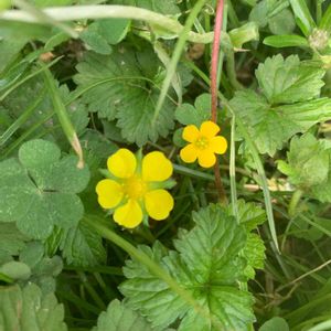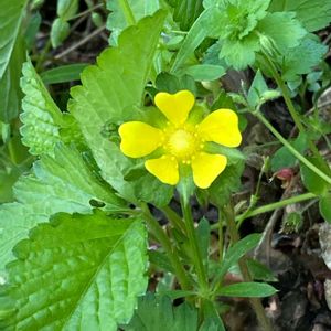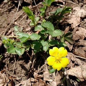 まだまだ実はできてませんけど、ヤブヘビイチゴ🐍🍓です。 花の後ろから、3裂した大きな副萼片がエリマキトカゲのように顔を出しています。 葉はヘビイチゴと同じく3出複葉ですが、ヘビイチゴの小葉が丸いのに対して長楕円形なのも特徴。