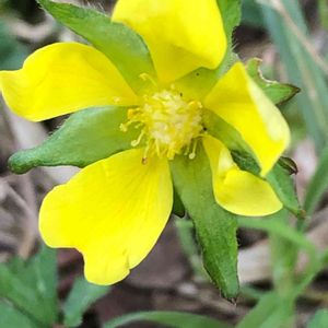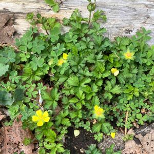 ヤブヘビイチゴ この近くでヘビ🐍にあったらホントのヤブヘビってやつですね😟 ヘビイチゴより花びらが細長く、葉っぱ🌱の先も少し尖っています。 バラ科キジムシロ属の多年草