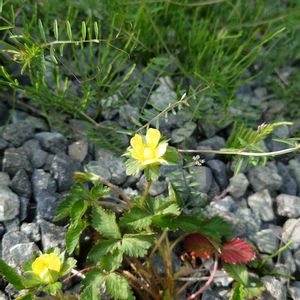 黄色の花びらが5枚、開花時の直径は2~3cmくらいです。いちごかな?ワイルドストロベリーかな? (近くで植えてたので)