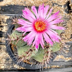 Echinocactus horizonthalonius 実生短棘・白棘翠平丸 二輪咲でも、綴化花でも無いよU^ェ^U極太短棘が邪魔して、コレが限開花なぁ〜😜 二番花です👍 4号カクタス広瀬ブランド鉢