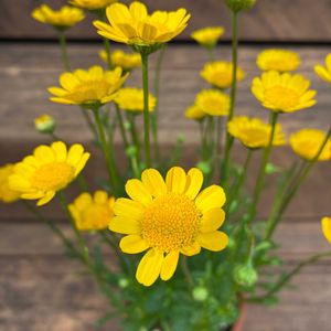 2024.2.19 マイガーデン。 タネから育てたクリサンセマム・アップライトイエローが咲き始めました。 まこSさん発信 🏷️月曜日は元気色の花 🏷️月曜日は玄関の花