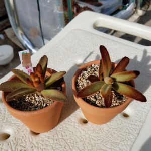 今日行ったダイソーさんで不死鳥と他いくつかの多肉さんを購入。 帰りに祖母のうちへ寄ったら子宝草が大きいのひとつと小さいの(大きいのが数年のうちに勝手に増えたらしい)が居たので、小さい方をひと株貰ってきました。 で、同じような増え方するのを並べて比べてみたくなったんです(/-\*) 若干左に見切れてる白いのは子宝草の子を挿してある鉢受けのお皿です。14匹も子をつけてました。繁殖力(?)がすごいっすね・・・。