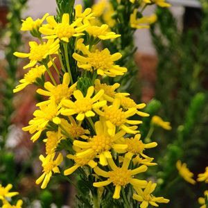 コミュニティセンター前で可愛く咲いていた花 ゴールデンクラッカー キク科 ユリオプス属 南アフリカ原産
