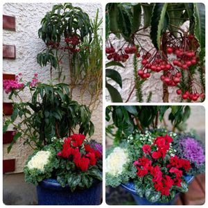 ☘️寄せ植え☘️ 庭の万両の実が赤くなって来たので🔴 真っ赤なガーデンシクラメンと葉牡丹をお迎えして寄せ植えにしました💕