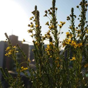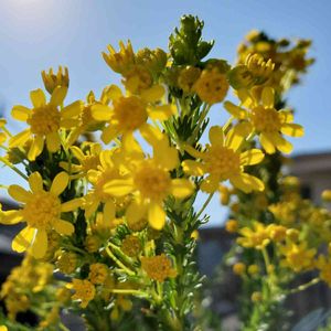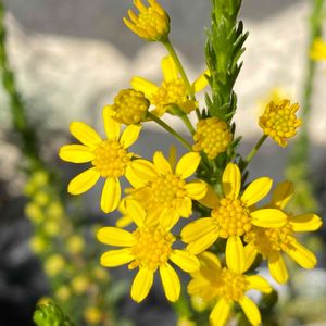 【ゴールデンクラッカー「ウィンタークラッカー」】 南アフリカ原産、キク科常緑中低木 ユリオプス・デージーの園芸品種。 枝先の葉の付け根から花柄を伸ばし、花径0.5~1㎝程度の黄色い頭状花を咲かせる。 一輪の花のように見えるのは、小さな花が集まった集合花で、中心部分の筒状花と、周囲で花弁のように見える舌状花からなる。 目に鮮やかな黄色の小花が、枝先にこぼれるように咲く様子は華やか。 ウィンタークラッカーは寒さに強い早生品種。 草丈:40㎝~400㎝ 花期:12月~5月 花色:黄色 吉本花城園@防府市