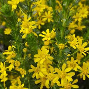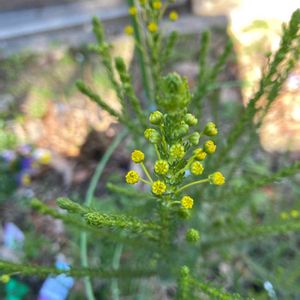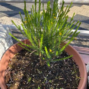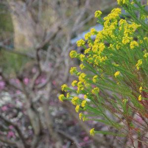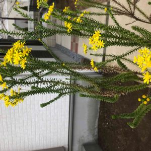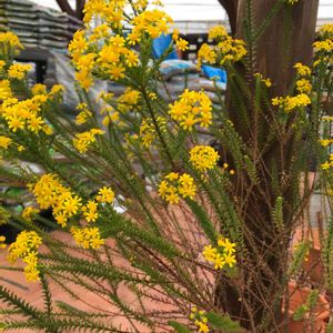 散歩がてらに、HCに寄り道。鉢に植えた、黄色い花木に目が止まりました。 名札が付いていなかったので、近くに居たバイトの店員に尋ねるも、名前は分からず。細い株立ちの、背丈1mくらいの木で、見た目はトゲトゲの柔らかな葉をブラシ状に付けて、先端近くに、6枚花弁の黄色い花を、5-6個咲かせていました。 誰か名前のわかる方、教えて下さい。 後ろの太い幹は、別の木です。