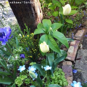 連投失礼します。🎵 仕込んでおいた三種類目のチューリップ🌷が出てきました~。💞 白に縁取りが紫のチューリップなんですが咲き始めはライムグリーンで爽やか~。(人´∀`)♪💚